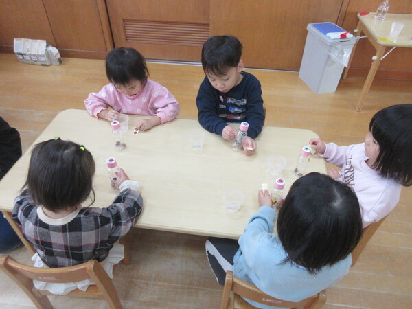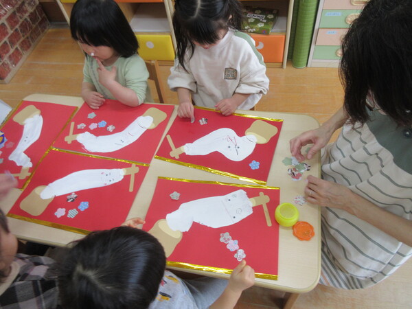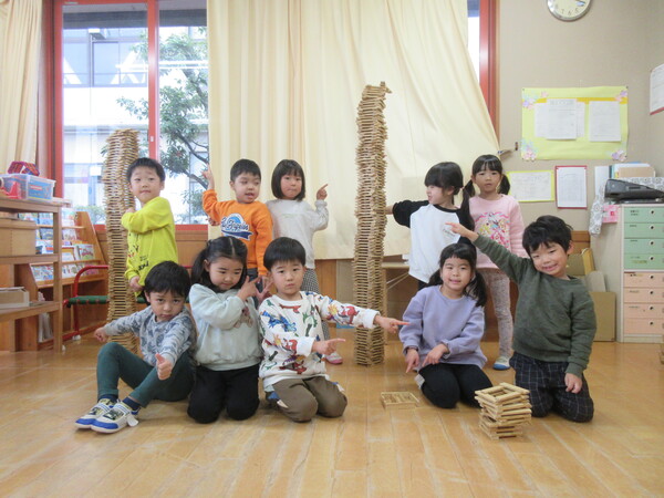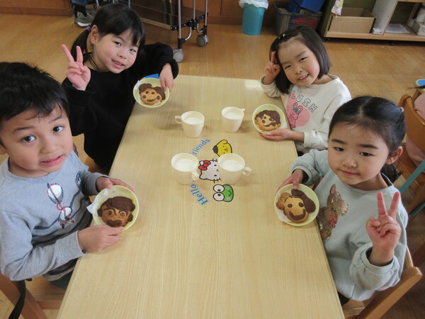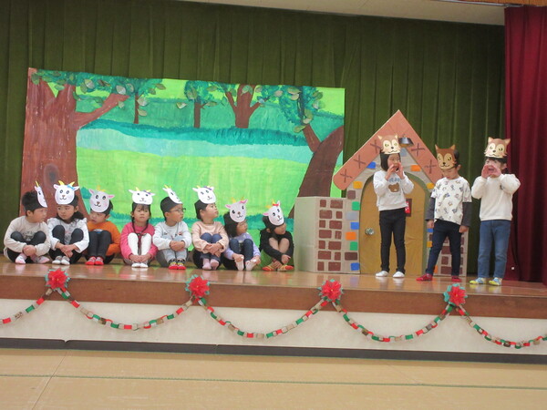 | 12月にある発表会に向けてクラス全体で取り組んでいます。 劇遊び「おおかみとこやぎ」は役になりきって演じている姿がとてもかわいいです。 おうちの方に”かっこいい姿を見てもらいたい”とみんな頑張っています。 給食では11月からお箸を使って食事をしています。少しずつお箸を使うことにも慣れてきて 大豆などもつまめるようになってきました。茶碗を持つことや姿勢良く食べることなども意識できるように 声かけもしています。 これから寒くなってきますが元気に楽しく過ごしたいと思います。 |