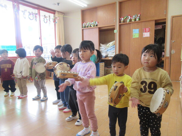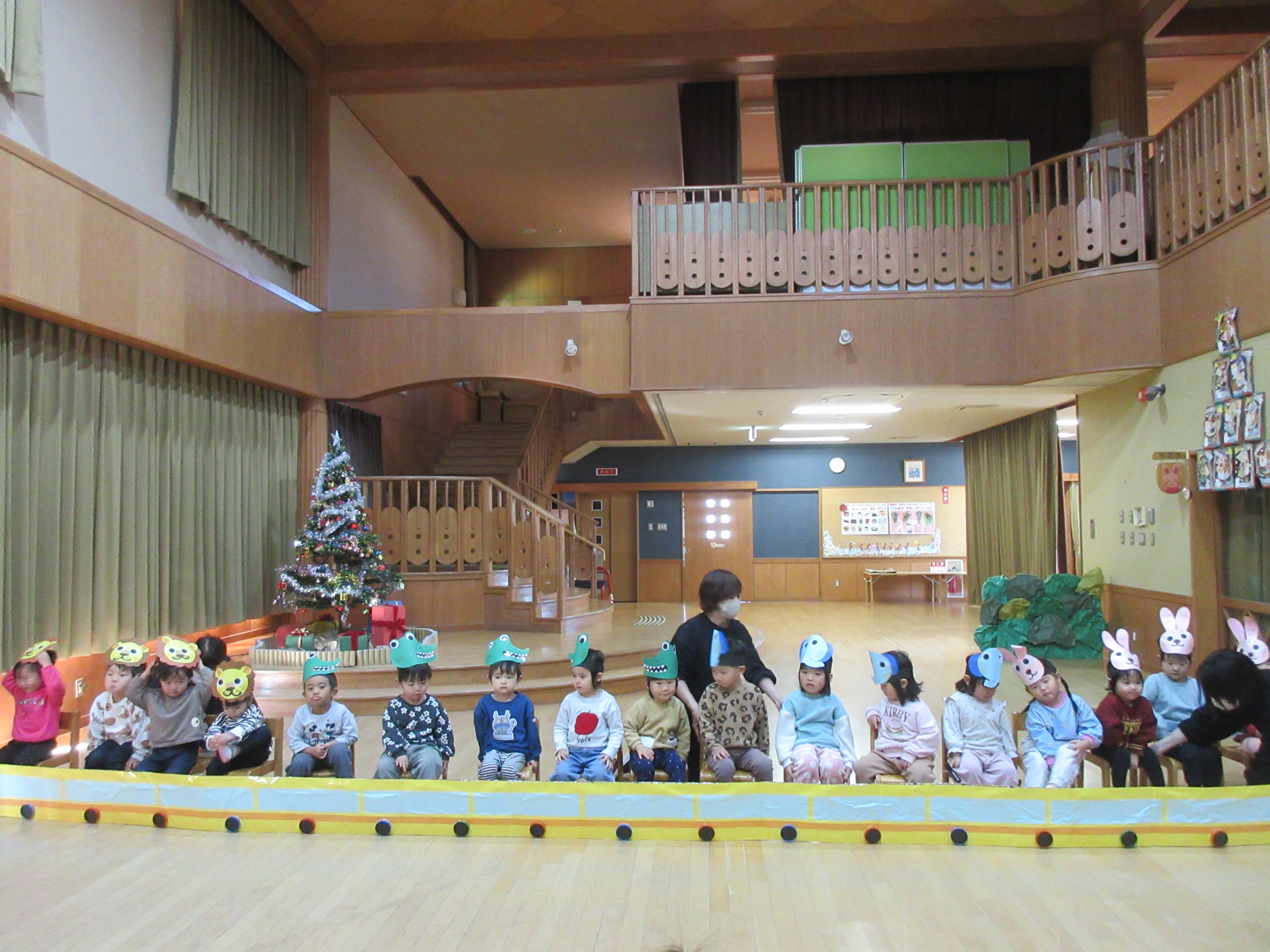 | 日頃、親しんできた「すてきなぼうしやさん」のお話の中で役になりきって、遊ぶことを楽しんできました。 劇あそびの中でも、ぼうしやさん、お客さんになりきっての、子どもたちのやり取りはとても可愛らしいです。 楽器遊びにも初挑戦しました!新しこと、少し難しいことにも頑張って取り組んでいるうさぎ組さんです。 |